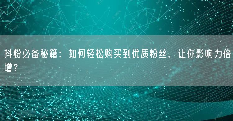 在抖音这个庞大的社交平台上,如何让自己的影响力倍增,成为众多用户中的佼佼者?除了优质的内容创作,购买优质粉丝也是提升影响力的重要途径。本文将为你揭秘抖粉必备秘籍,教你如何轻松购买到优质粉丝。